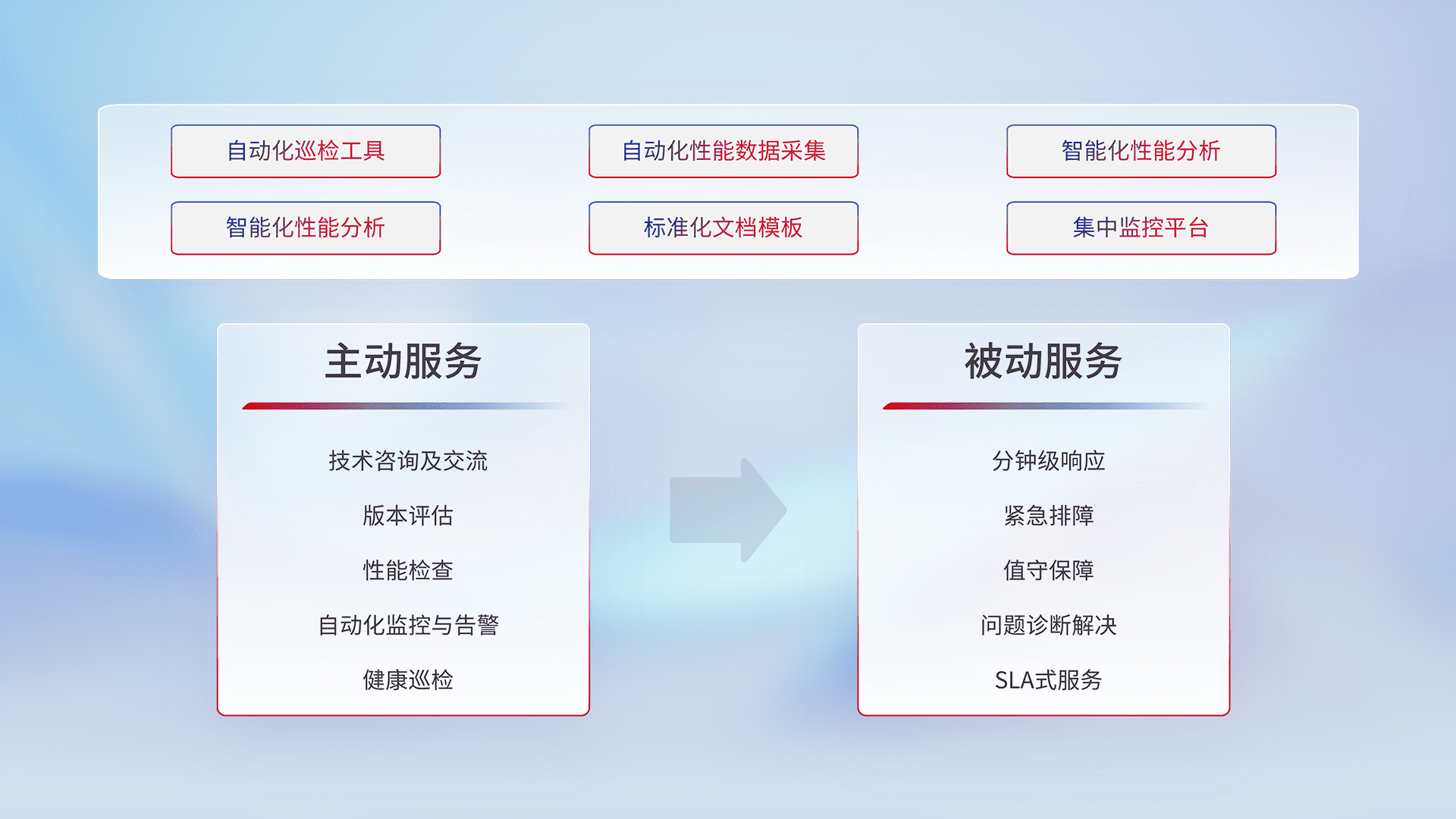 智能化工具和标准化文档,,保障服务质量,,,提供主动服务(包含技术咨询、、、、版本评估、、性能检查、、、、自动化监控与告警、、健康巡检)和被动服务包含(分钟级响应、、紧急排障、、值守保障、、、问题诊断解决、、SLA服务)。。